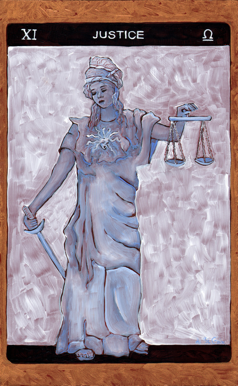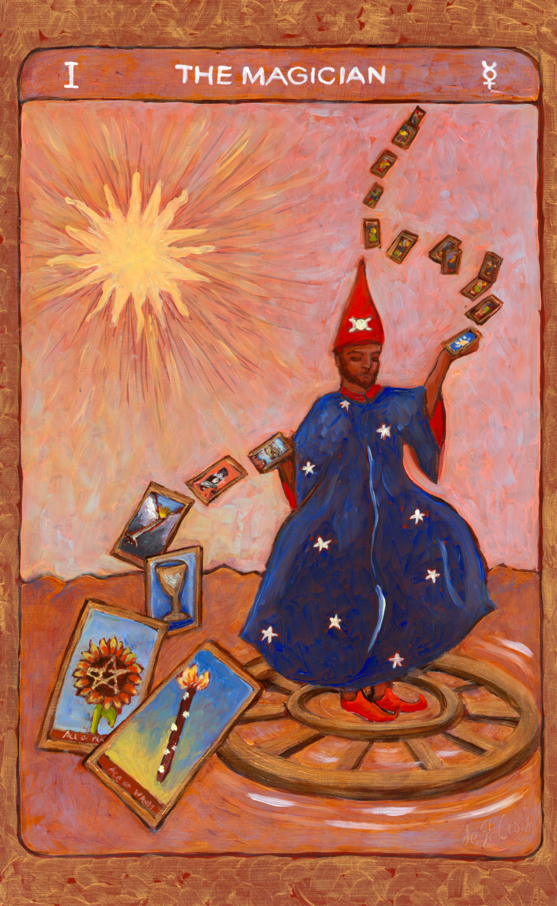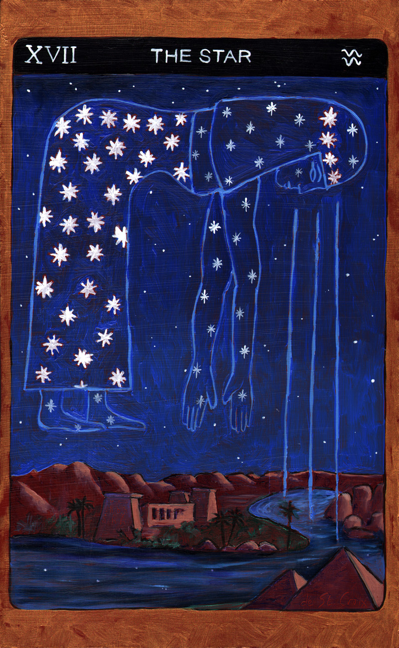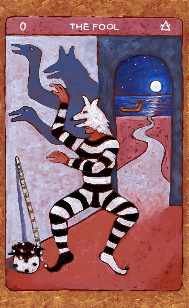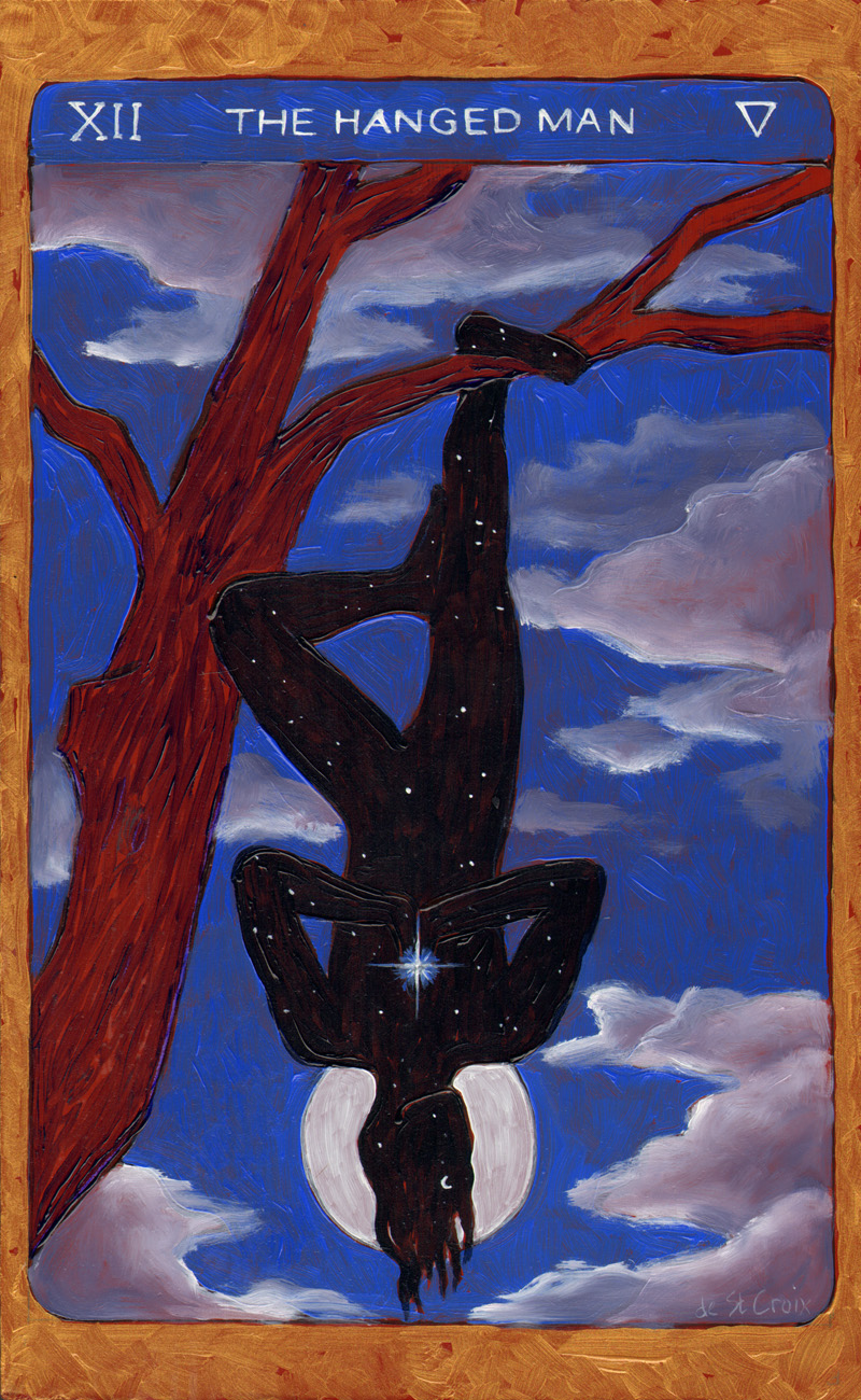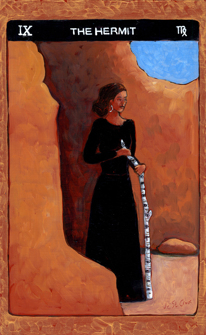 These oil paintings explore the timeless archetypes of Tarot. Twenty-two paintings 13” x 8” from the Major Arcana in Tarot de St. Croix shows the journey of the soul beginning with The Fool and culminating with The World drawn from many cultures. Another Hermit and Star continue the story of the archetypes in a larger format.
